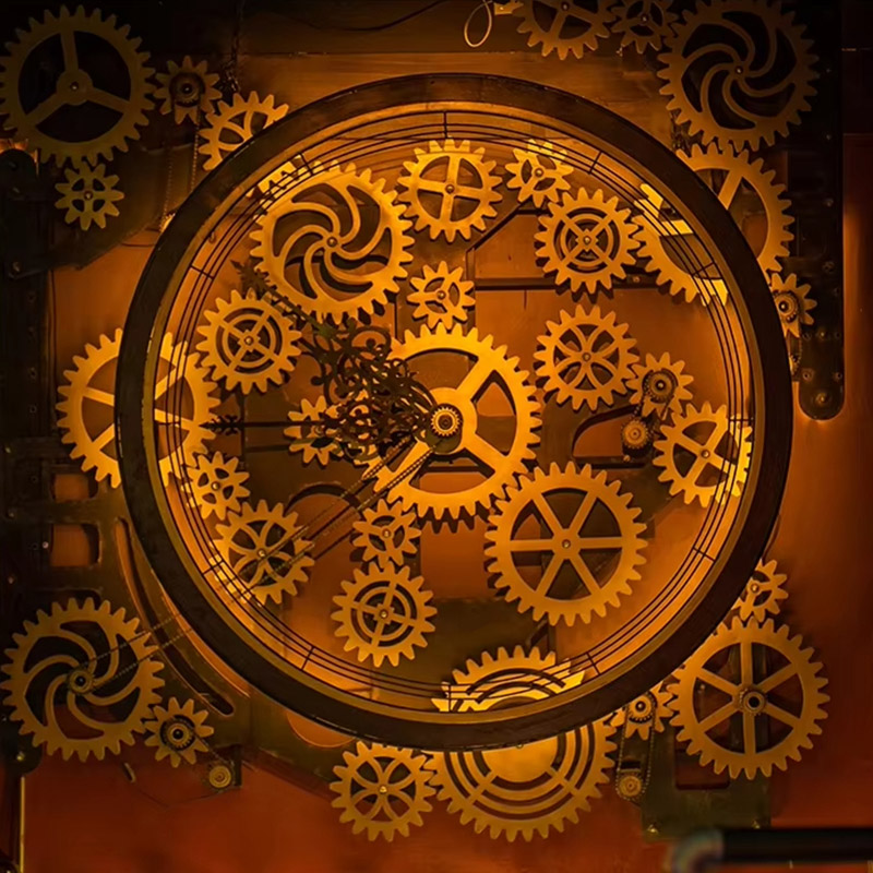 "Gear Wall Clock" is a decorative wall clock that perfectly combines steampunk style with retro design elements. The metal surface texture is matched with a large number of gears and mechanical structures to present an industrial and retro feel of the mechanical age. The gears rotate with the hour and minute hands through mechanical movement, and the LED lights highlight the rock style of retro metal as a whole.