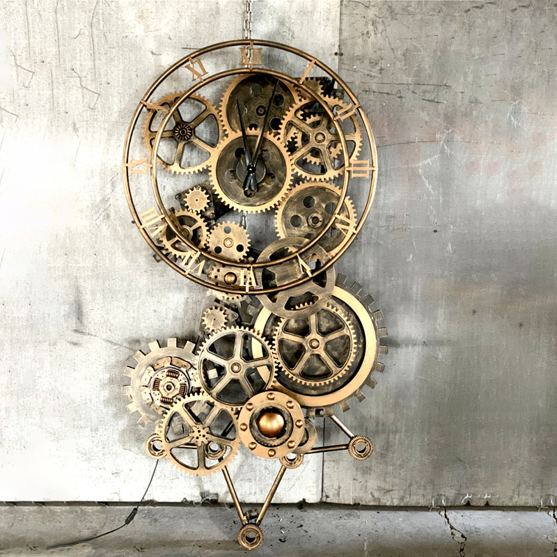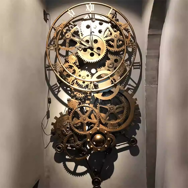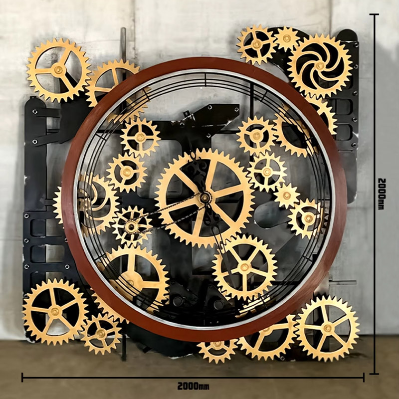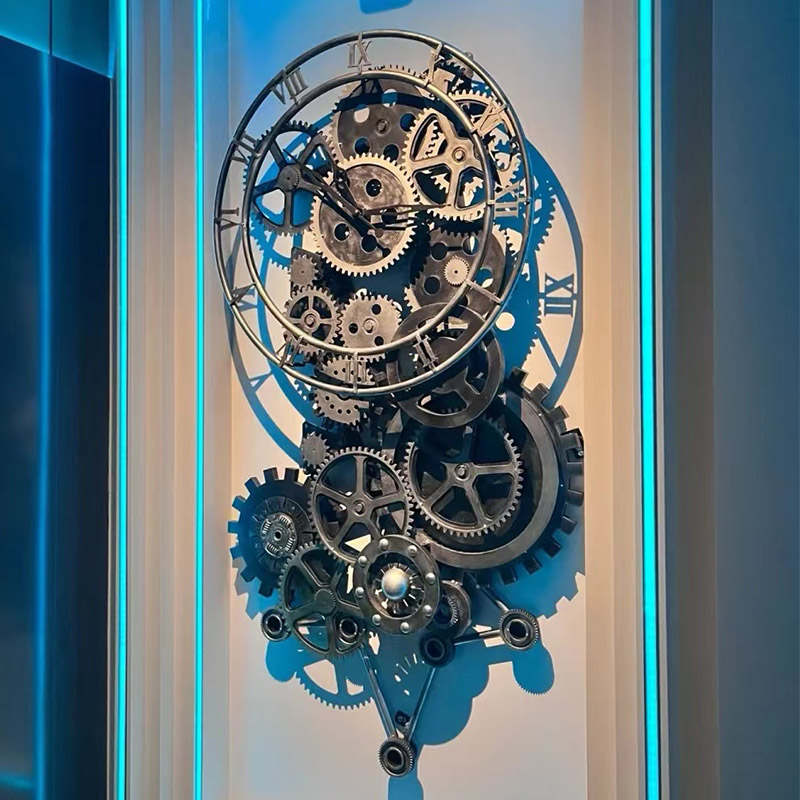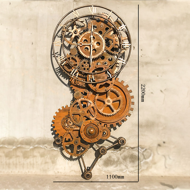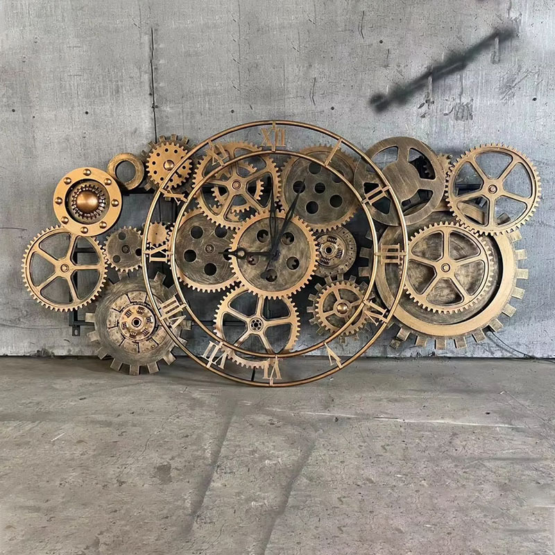 "Gear Wall Clock" is made of metal iron and matched with old-fashioned craftsmanship, which adds a retro atmosphere. Each gear is carefully designed, which is also the biggest feature of the entire artwork. The design inspiration comes from the steam age of the 19th century, and incorporates the mechanical aesthetics of the industrial revolution. It often emphasizes the historical sense and age of time with bronze, rust, black, etc.
