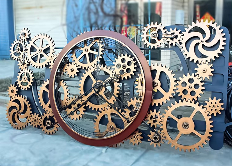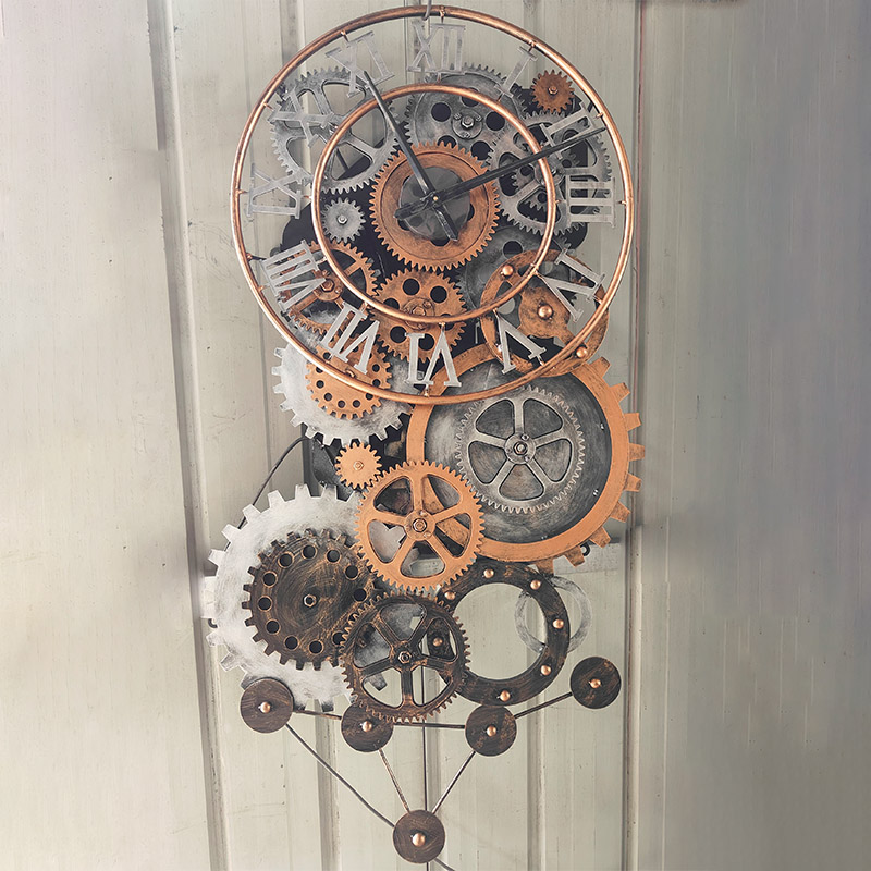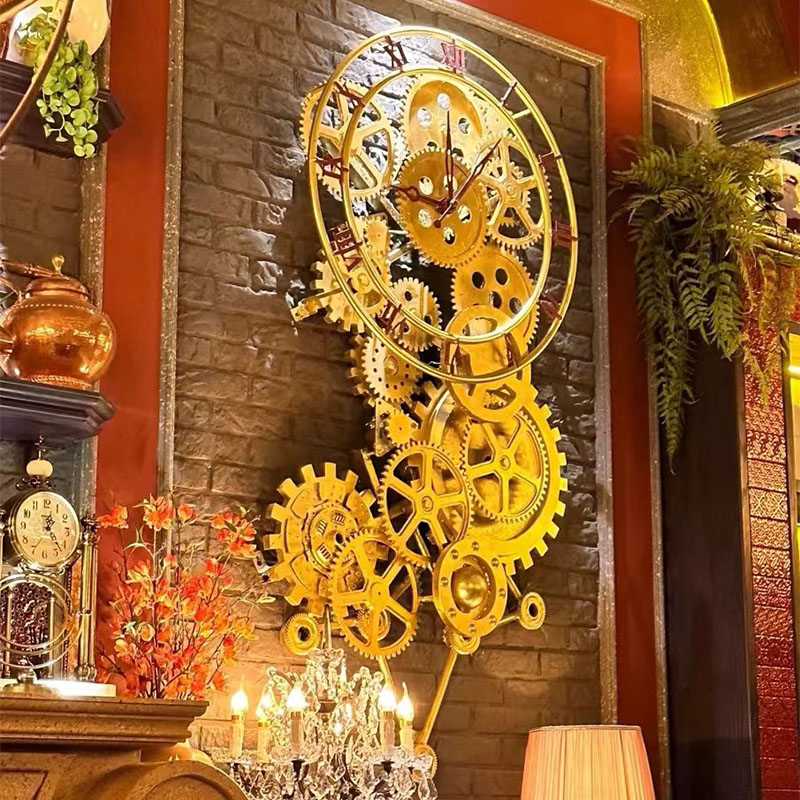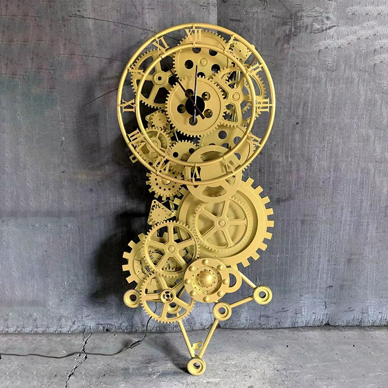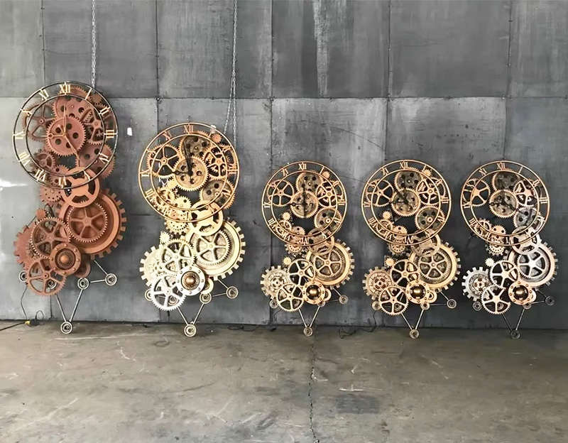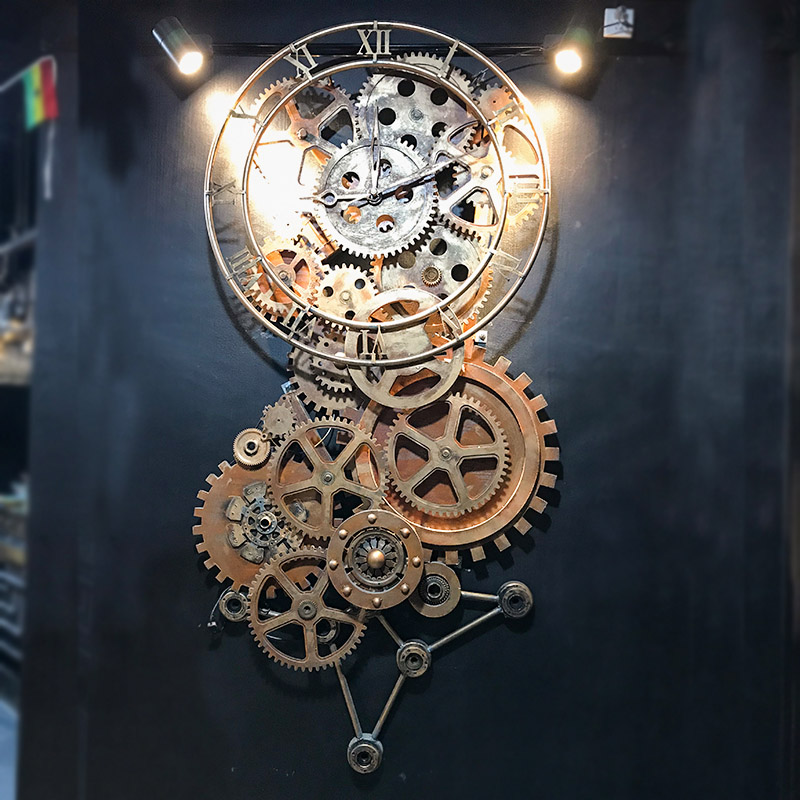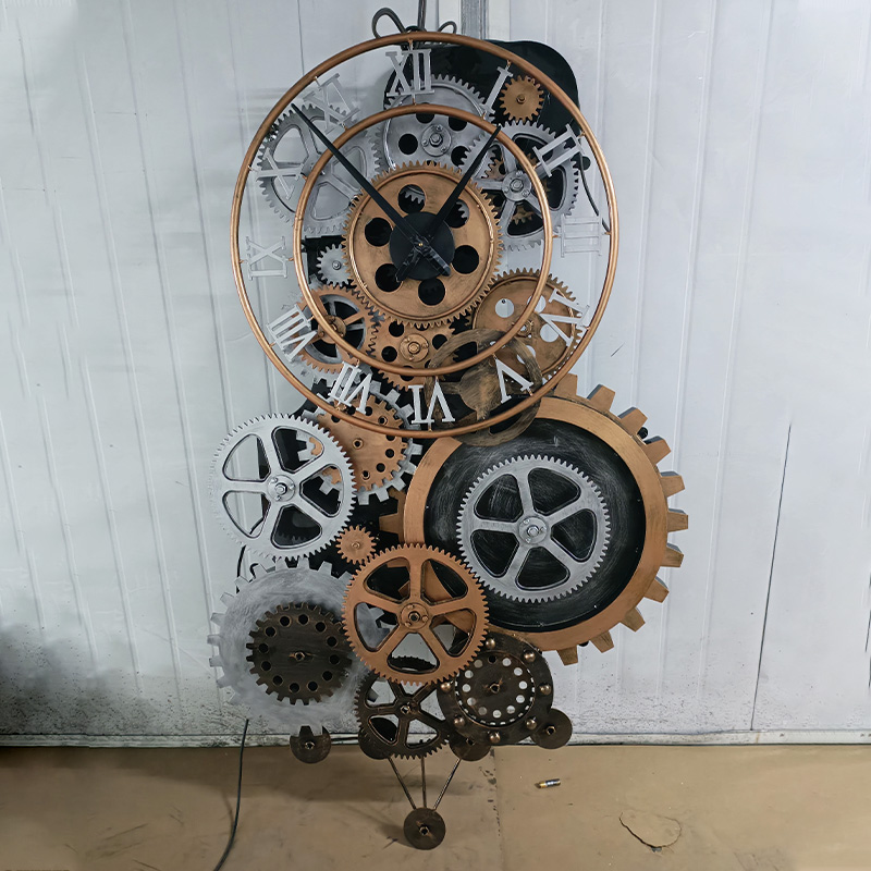 "Gear Wall Clock" is made of metal iron and matched with old-fashioned craftsmanship, which adds a retro atmosphere. Each gear is carefully designed, which is also the biggest feature of the entire artwork. The design inspiration comes from the steam age of the 19th century, and incorporates the mechanical aesthetics of the industrial revolution. It often emphasizes the historical sense and age of time with bronze, rust, black, etc.