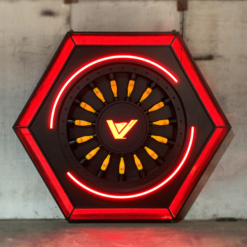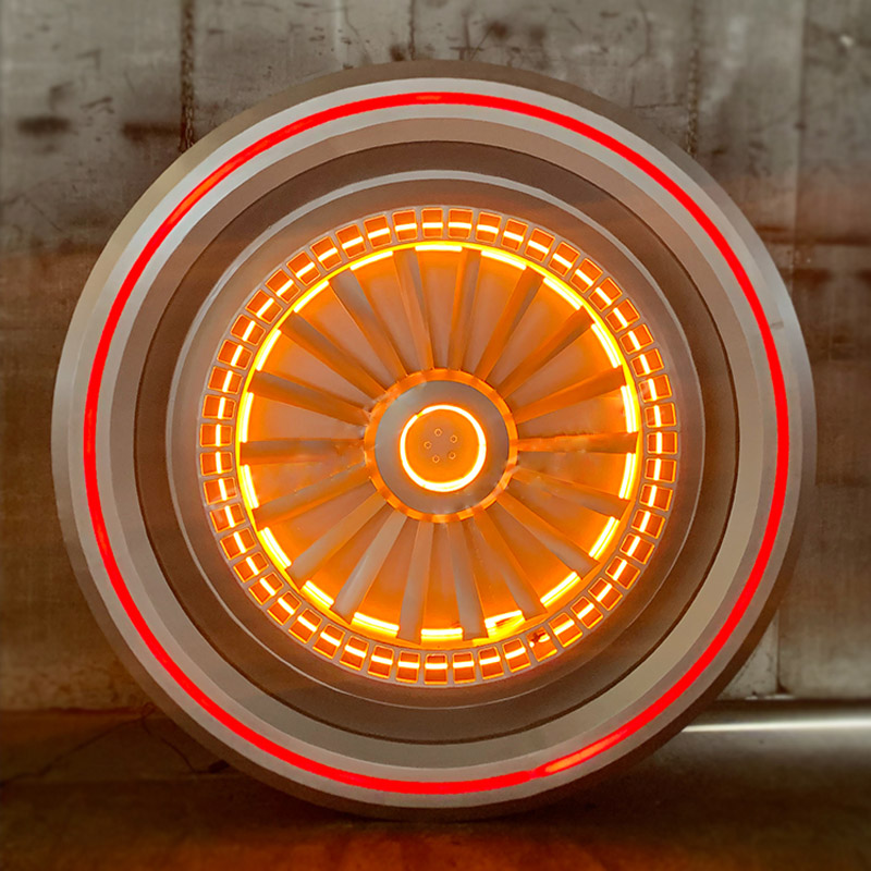 "Propeller Turbofan" is a wall decoration suitable for public places such as bars, restaurants, hotels, and clubs. It not only has a punk heavy metal style but also has a cool sense of technology. It is not just a simple decoration, it is also a rotatable fan with spray special effects and colorful LED lights. It can catch everyone's attention and leave a footprint for the first time.