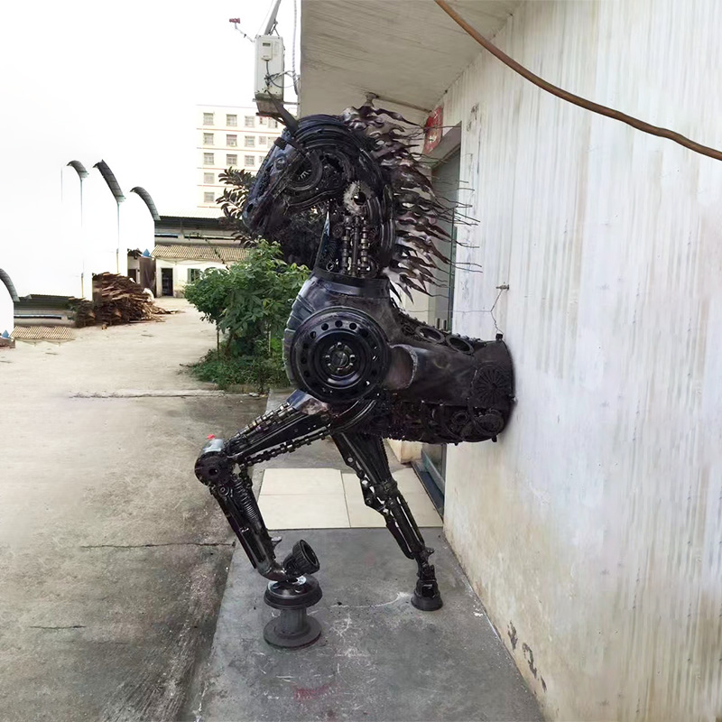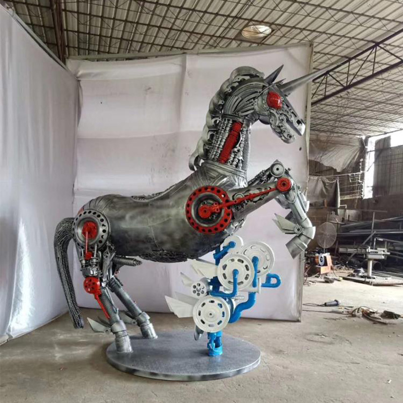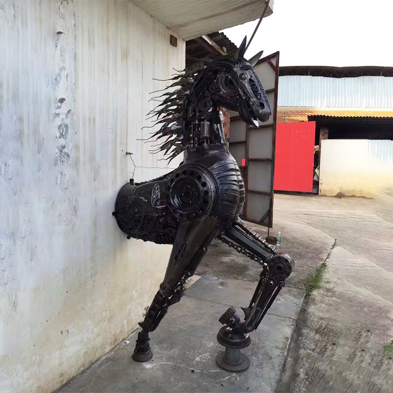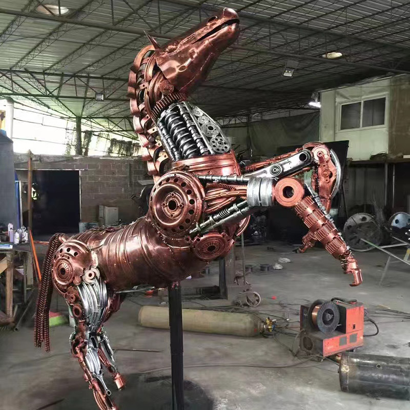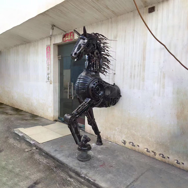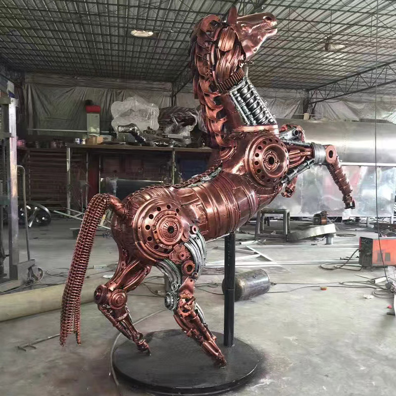 Sharp edges, exaggerated horse mane, and mechanized body parts symbolize freedom, rebellion and unruliness in punk culture. The use of metal materials not only enhances the visual impact but also increases the durability and weight of the sculpture.