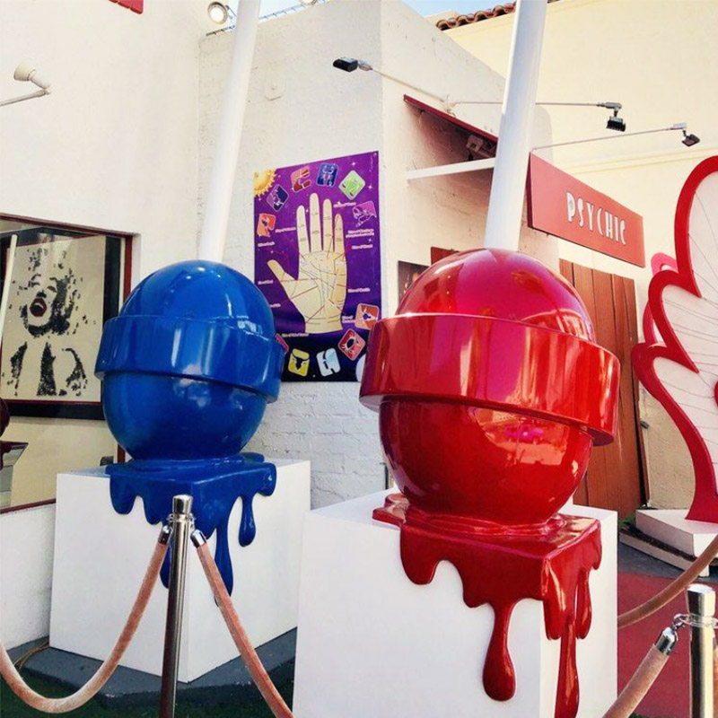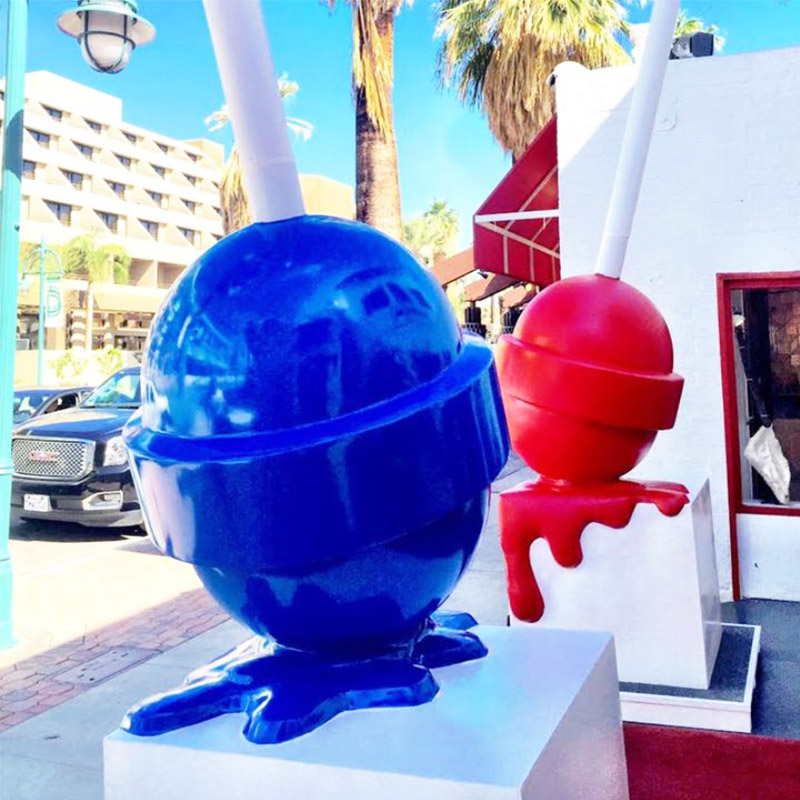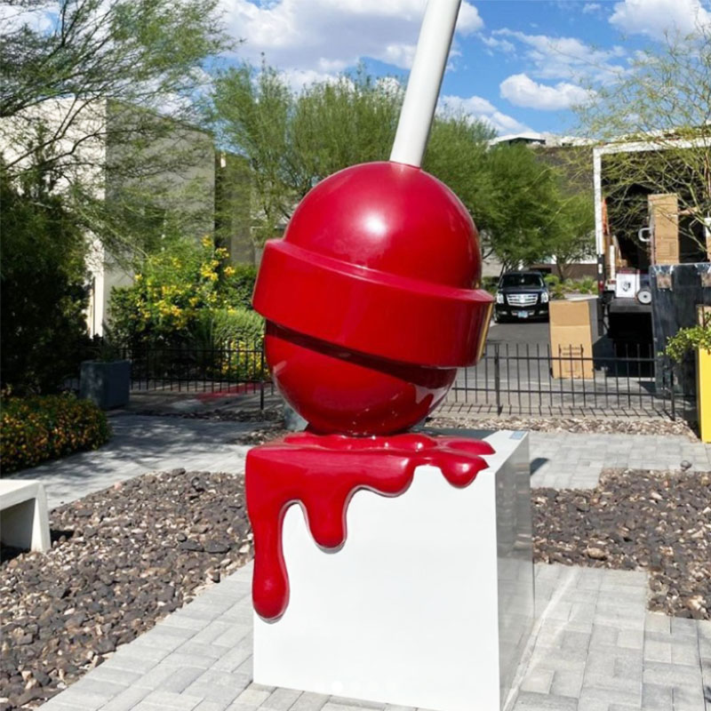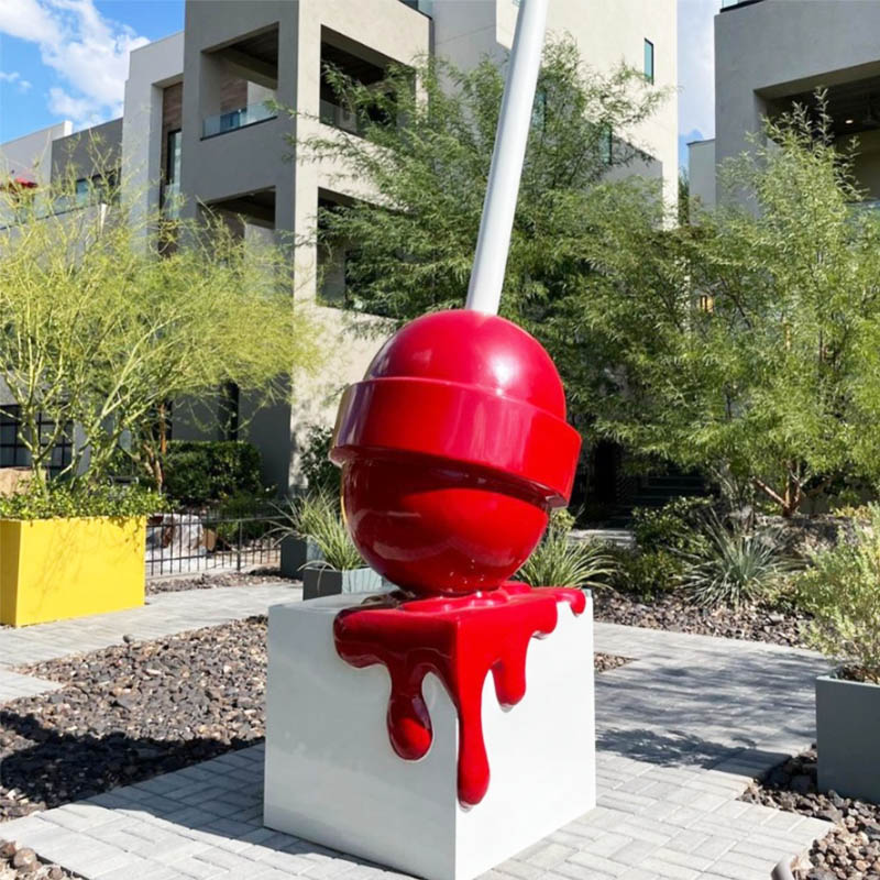 "Melting Lollipop" Sculpture is made of high-quality fiberglass, which is durable and can withstand wind and rain without being easily damaged. The pigment is made of high-quality car paint, which is not easy to crack even after long-term display. In addition to being strong, the fiberglass material is also highly plastic. Because of this advantage, the melting state of the lollipop can be fully reflected.