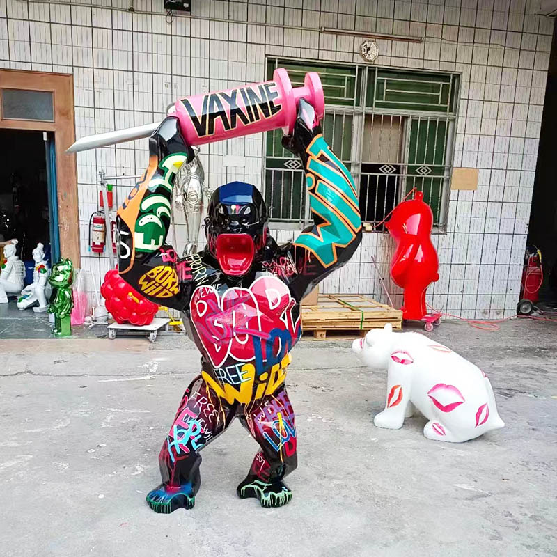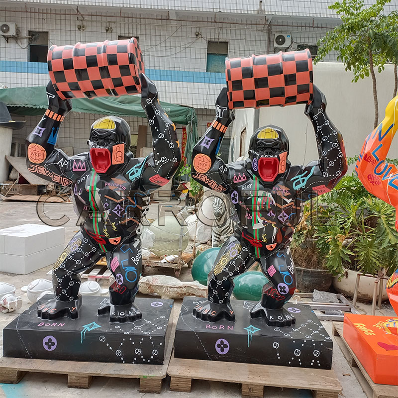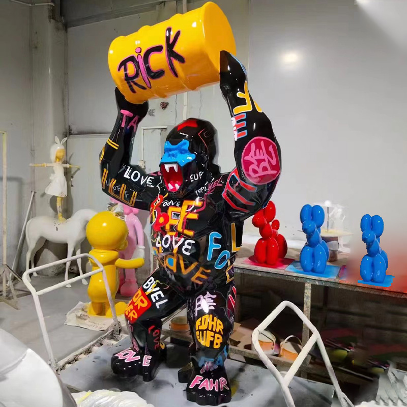 Pop art lifting oil drum and beating chest graffiti huge outdoor gorilla fiberglass sculpture