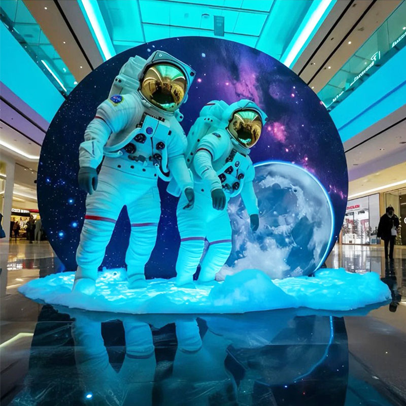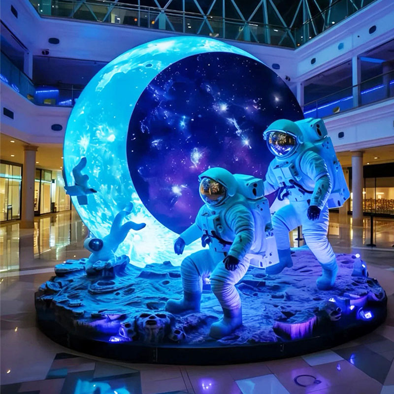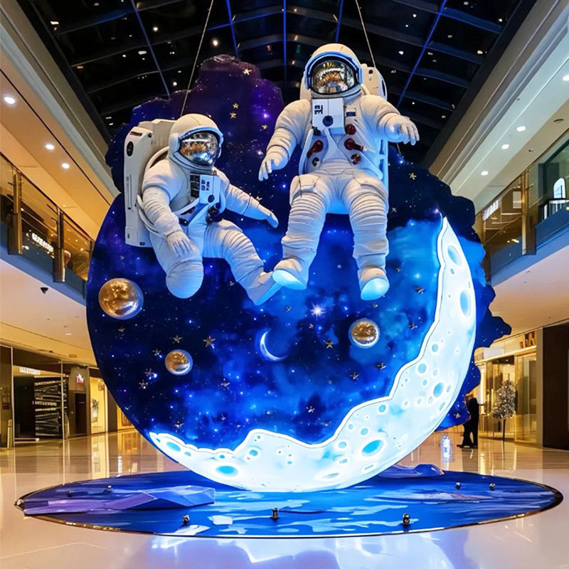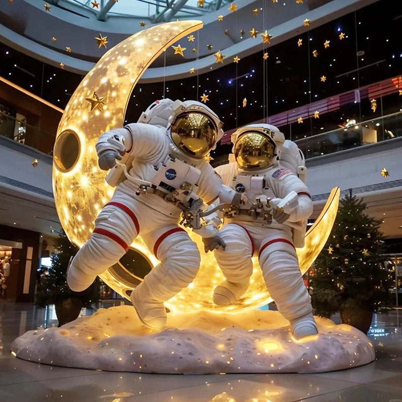 "Astronaut" sculptures usually highly restore the equipment of real astronauts, including astronauts' details, oxygen backpacks, helmets, demeanor, postures, etc. The astronauts' walking, waving, and standing postures in the sculptures show the spirit of exploration. In the mall, two astronauts are on the moon with lights on.